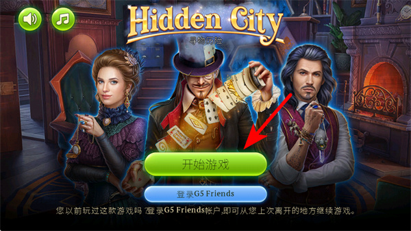 1、進入游戲啟動界面后,點擊紅色箭頭指向的開始游戲按鈕,開啟的尋物冒險,這是進入游戲的關(guān)鍵操作,準確點擊才能加載尋物關(guān)卡。