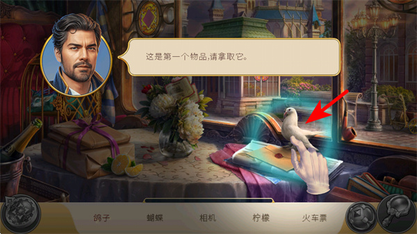 2、進入尋物場景后,跟隨紅色箭頭指引,點擊畫面中的鴿子區(qū)域,拾取第一個目標(biāo)物品鴿子,完成這一步尋物操作,推進關(guān)卡的任務(wù)進度。