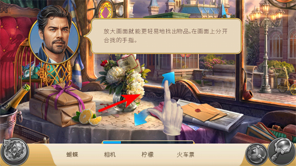 3、繼續(xù)跟隨紅色箭頭指引,點擊畫面中花瓶旁的區(qū)域,拾取目標(biāo)物品蝴蝶,同時按照提示放大畫面,更清晰地查找剩余物品,提升尋物效率。