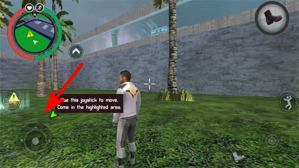 1、進入游戲場景后,操控紅色箭頭指向的移動搖桿,控制角色移動到高亮區(qū)域,推進游戲基礎操作,跟隨提示調(diào)整角色位置,確保進入指定區(qū)域。