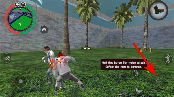 2、遇到敵人后,長按紅色箭頭指向的近戰(zhàn)攻擊按鈕,對敵人發(fā)起近戰(zhàn)攻擊,擊敗該敵人以繼續(xù)游戲流程,注意長按按鈕的時長來確保攻擊生效。