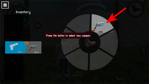 3、打開道具界面后,點擊紅色箭頭指向的武器選項,切換到新的武器,這是更換戰(zhàn)斗裝備的關(guān)鍵操作,需準確點擊對應武器區(qū)域完成切換。