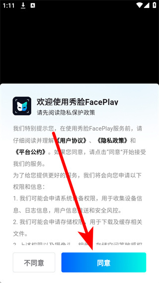 1、打開(kāi)秀臉,進(jìn)入后彈出彈窗,點(diǎn)擊同意,進(jìn)入應(yīng)用主界面。
