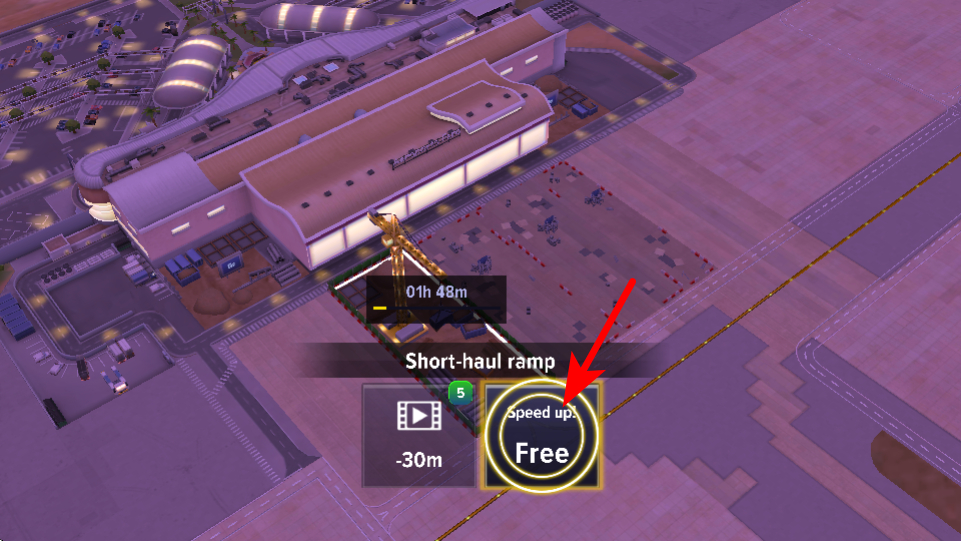 2、為加快建造進(jìn)度,點(diǎn)擊紅色箭頭指向的Speed up Free按鈕,免費(fèi)加速Short-haul ramp的建造,提前完成設(shè)施建設(shè)以推進(jìn)機(jī)場運(yùn)營。