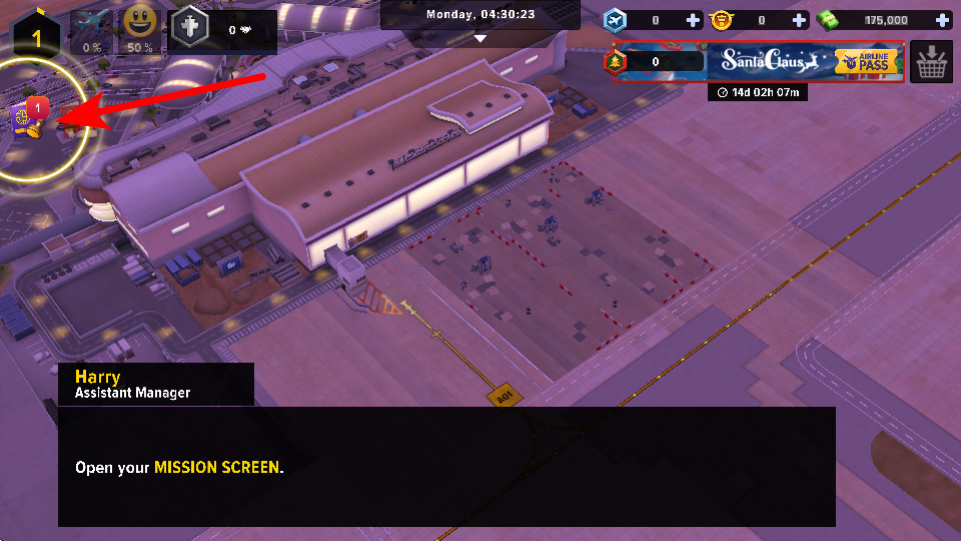 3、根據(jù)引導(dǎo)提示,點(diǎn)擊紅色箭頭指向的任務(wù)按鈕,打開任務(wù)界面,查看當(dāng)前的主線與支線任務(wù),明確機(jī)場經(jīng)營的目標(biāo)方向。
