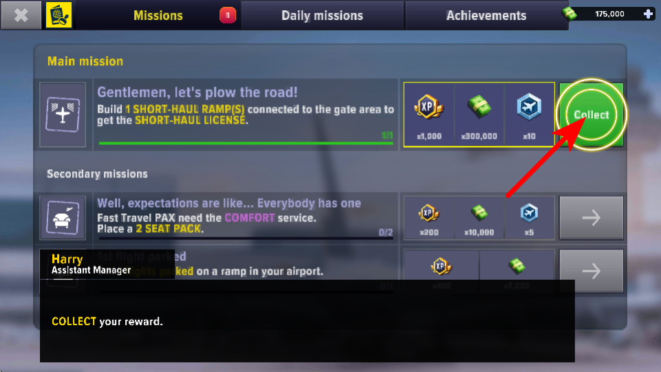 4、在任務(wù)界面中,點(diǎn)擊紅色箭頭指向的Collect按鈕,領(lǐng)取完成主線任務(wù)后的獎勵,獲取資源與許可證,助力機(jī)場的進(jìn)一步發(fā)展。