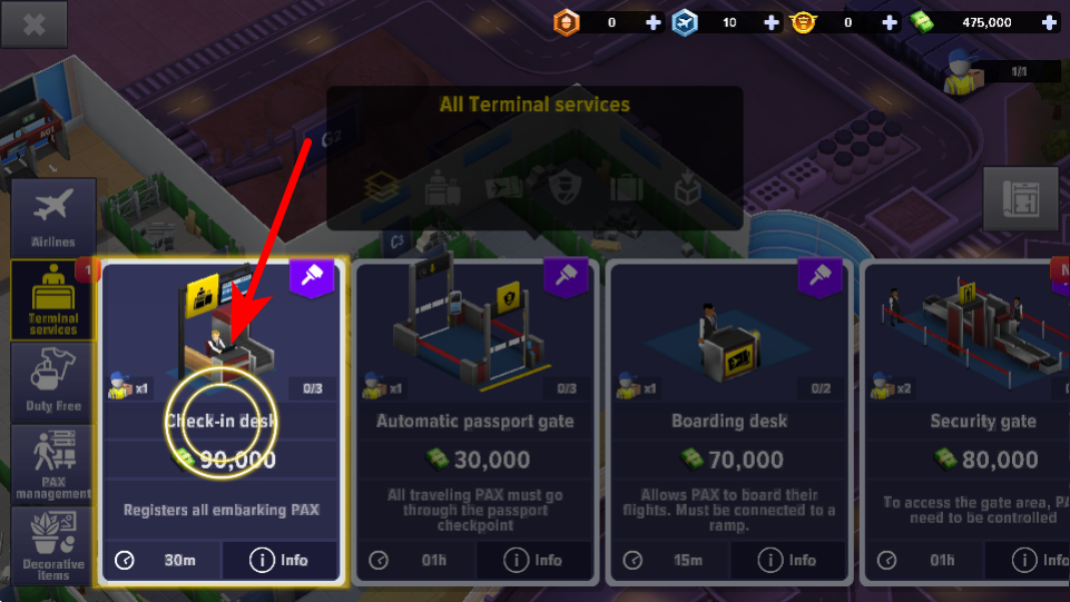 3、在設(shè)施選擇界面,點(diǎn)擊紅色箭頭指向的Check-in desk設(shè)施,消耗資源建造值機(jī)柜臺,這是航站樓的基礎(chǔ)服務(wù)設(shè)施,用于流程。