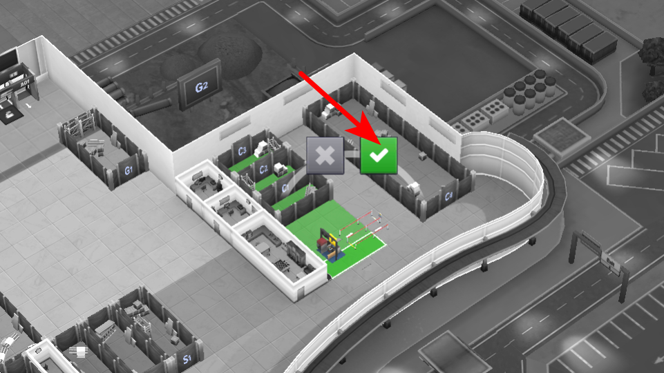 4、進(jìn)入設(shè)施放置界面后,點(diǎn)擊紅色箭頭指向的對勾按鈕,確認(rèn)的放置位置,完成該設(shè)施的建造,推進(jìn)航站樓的服務(wù)功能完善。