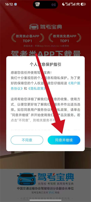 1、打開駕考寶典,進(jìn)入后彈出彈窗,點(diǎn)擊同意并繼續(xù),進(jìn)入應(yīng)用首頁。