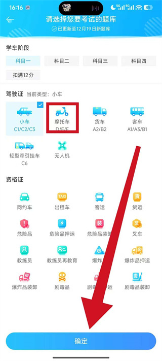 4、在題庫頁面的駕駛證分類下,選中摩托車選項(xiàng),點(diǎn)擊頁面底部的確定,即可完成切換。