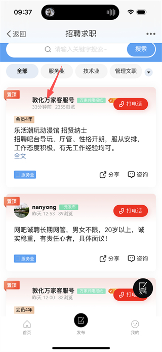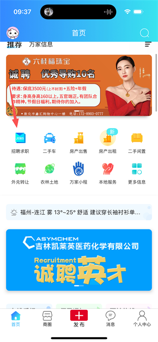 1、在敦化萬家首頁點(diǎn)擊招聘求職選項,進(jìn)入招聘求職列表頁面。