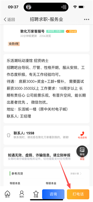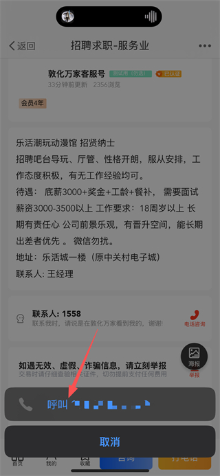 4、在彈窗中點(diǎn)擊呼叫按鈕,發(fā)起與招聘方的電話聯(lián)系,完成求職操作。