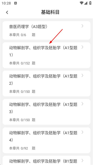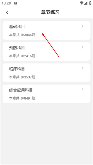2、在章節(jié)練習頁面選擇基礎(chǔ)科目選項,進入基礎(chǔ)科目題目列表頁。