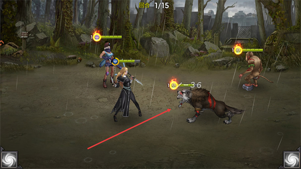 1、回合1選擇目標(biāo)敵人如狼型怪物,發(fā)起攻擊,推進(jìn)戰(zhàn)斗流程。