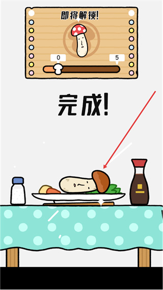 4、完成關(guān)卡后會出現(xiàn)完成提示,界面顯示即將解鎖新蘑菇,積累足夠關(guān)卡進(jìn)度即可解鎖對應(yīng)的新蘑菇。