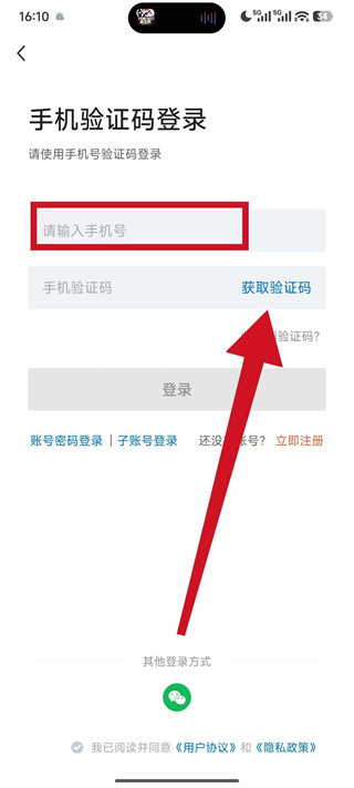3、在登錄界面的手機號欄填寫你的手機號碼,同時勾選相關(guān)協(xié)議。