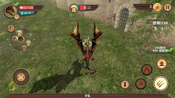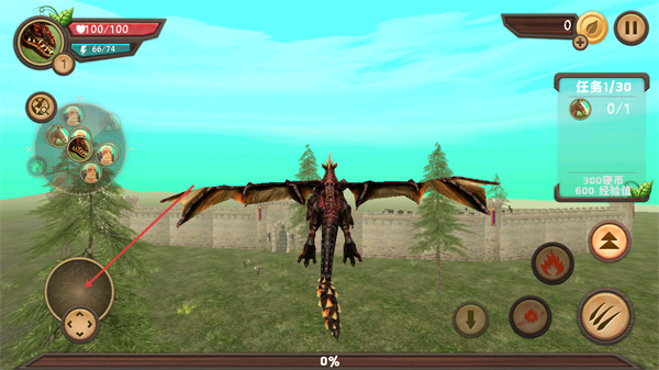 4、進(jìn)入游戲主場(chǎng)景后,用左側(cè)移動(dòng)按鈕操控龍移動(dòng),完成右側(cè)任務(wù)1/30的目標(biāo)以獲取硬幣和經(jīng)驗(yàn)值。