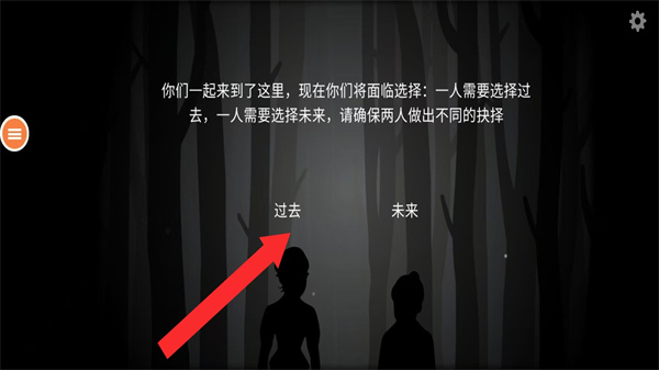1、進(jìn)入選擇界面后,根據(jù)提示點擊紅色箭頭指向的過去選項,完成雙人不同選擇的劇情要求,這是關(guān)鍵操作。