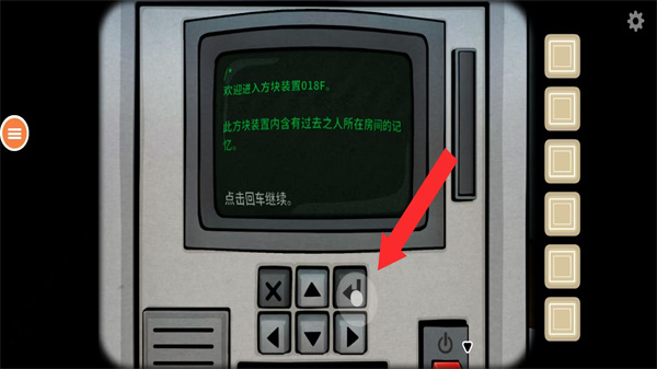 4、在電腦界面中,點擊紅色箭頭指向的白色按鈕,觸發(fā)點擊回車鍵的交互操作,推進(jìn)方塊裝置的劇情流程。
