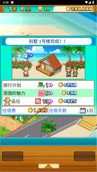 1、看到別墅1號(hào)樓完成的提示后,該設(shè)施可產(chǎn)生住宿費(fèi)1505等收益,同時(shí)旅行計(jì)劃、魅力等維度也會(huì)帶來(lái)對(duì)應(yīng)的貨幣增加。