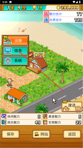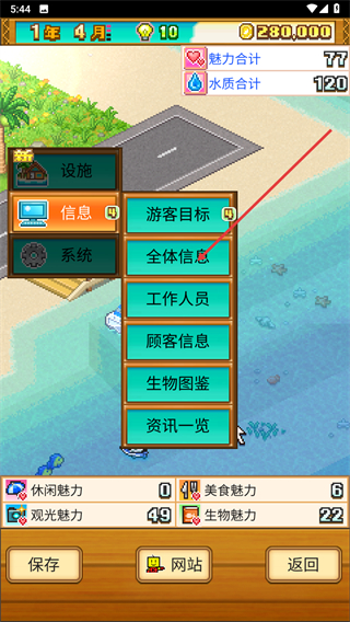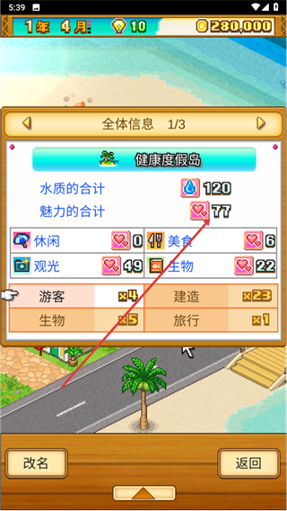 4、在全體信息界面中,可查看度假島的水質(zhì)合計(jì)120、魅力合計(jì)77等數(shù)據(jù),了解當(dāng)前的運(yùn)營(yíng)狀態(tài)。