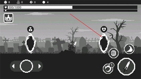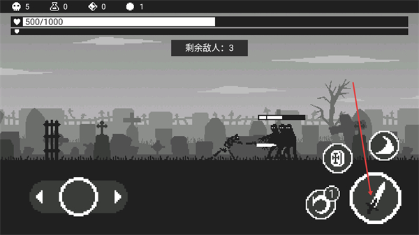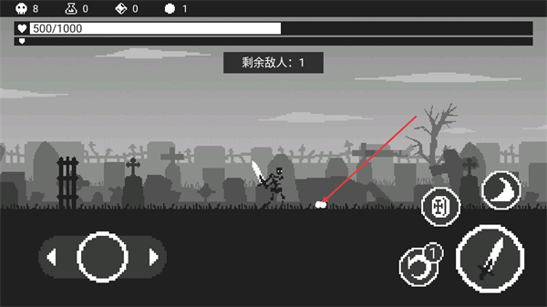 3、當前界面顯示剩余敵人,操控角色靠近骷髏敵人,擊敗敵人后可以拾取地面上掉落的白色金幣進行獲取。