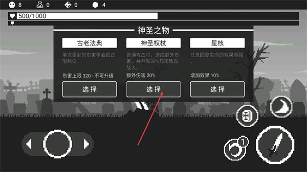 4、戰(zhàn)斗結(jié)束后進入神圣之物選擇界面,可點擊神圣權(quán)杖對應(yīng)的選擇按鈕,獲取其額外傷害等戰(zhàn)斗增益效果。