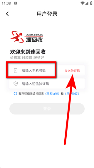 3、在用戶登錄頁面,輸入手機號,點擊發(fā)送驗證碼。