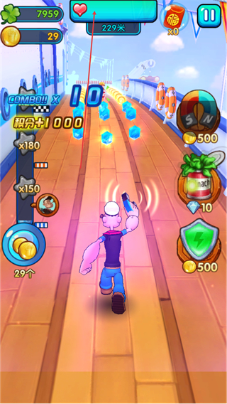 除菠菜外,還設(shè)置了磁鐵、護(hù)盾、雙倍金幣等多種增益道具,同時(shí)加入限時(shí)挑戰(zhàn)、障礙競速等特色玩法,讓單一的跑酷過程變得更加多元有趣。