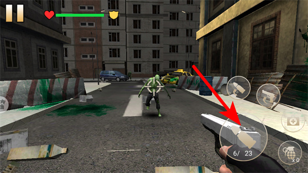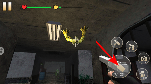 2、進(jìn)入關(guān)卡后,點(diǎn)擊右側(cè)的武器按鈕如手槍,瞄準(zhǔn)出現(xiàn)的怪物進(jìn)行射擊,消耗彈藥來消滅敵人。