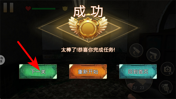 3、完成當(dāng)前關(guān)卡的怪物消滅任務(wù)后,點(diǎn)擊下一關(guān)按鈕,進(jìn)入新的場景繼續(xù)挑戰(zhàn)更強(qiáng)的敵人。