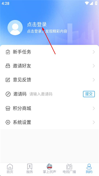 2、在個(gè)人中心頁面,點(diǎn)擊點(diǎn)擊登錄區(qū)域,可進(jìn)入用戶登錄頁面。