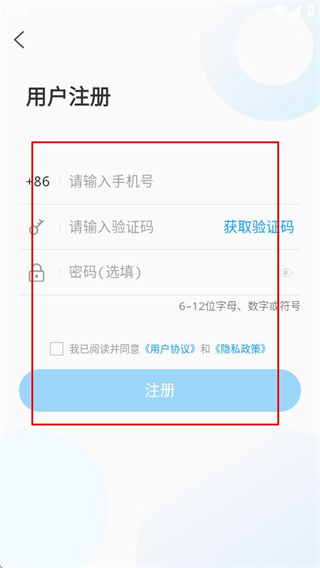 4、在注冊頁面,填寫信息并勾選協(xié)議后,點(diǎn)擊注冊按鈕即可完成賬號(hào)注冊。