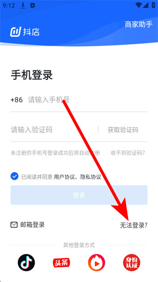 1、打開抖店,進(jìn)入手機(jī)登錄頁(yè)面后,點(diǎn)擊頁(yè)面中的無法登錄。