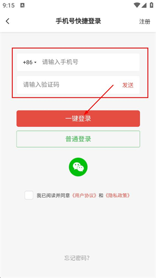 3、在快捷登錄頁面,填寫手機(jī)號(hào)和驗(yàn)證碼,點(diǎn)擊一鍵登錄完成登錄操作。