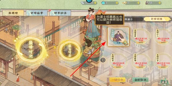 1、玩家在分館運(yùn)營(yíng)界面招募謀士,將其任命到對(duì)應(yīng)崗位,這些謀士能提升麻將館的收益,助力后續(xù)的資源積累。