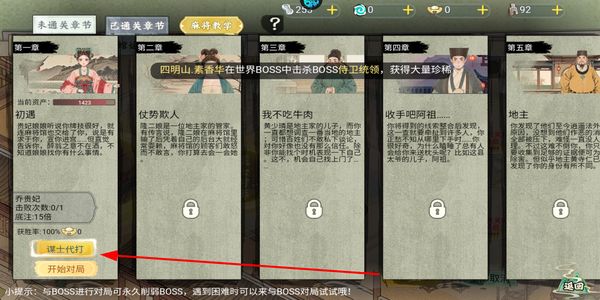 2、進(jìn)入關(guān)卡章節(jié)界面,選擇對(duì)應(yīng)章節(jié)后點(diǎn)擊謀士代打,可借助謀士來(lái)削弱對(duì)手,為后續(xù)對(duì)局降低難度。