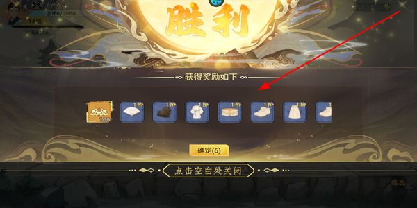 4、對(duì)局勝利后會(huì)彈出獎(jiǎng)勵(lì)界面,可獲得元寶和裝備等獎(jiǎng)勵(lì),點(diǎn)擊確定或空白處關(guān)閉界面,獎(jiǎng)勵(lì)會(huì)自動(dòng)到賬。