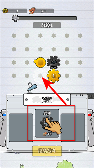 1、在商店界面瞄準(zhǔn)兵種選項(xiàng),消耗對(duì)應(yīng)資源解鎖新單位,把它丟進(jìn)戰(zhàn)場(chǎng)道具槽,給己方隊(duì)伍加個(gè)戰(zhàn)斗力。