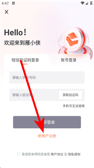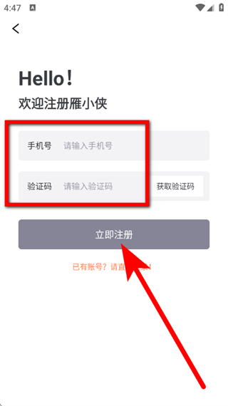 5、在雁小俠注冊(cè)頁(yè)面,輸入手機(jī)號(hào)和驗(yàn)證碼,點(diǎn)擊立即注冊(cè),完成注冊(cè)。