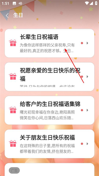 2、在分類頁面,點擊目標祝福語條目,可進入該祝福語的詳情頁面。