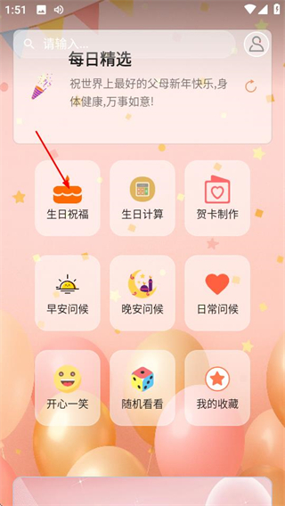 1、進入首頁后,點擊生日祝福選項,可進入生日祝福語分類頁面。