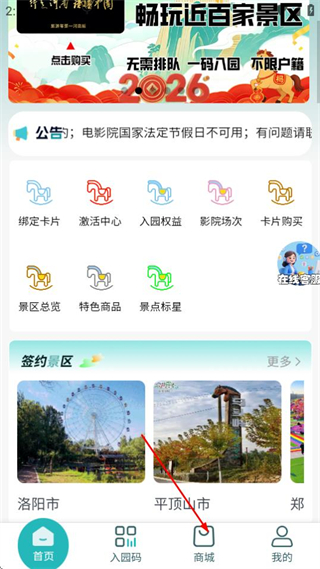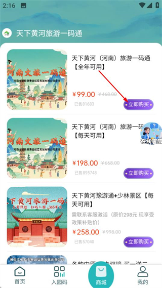 1、進入首頁后,點擊底部的商城選項,可進入旅游一碼通商品列表頁面。
