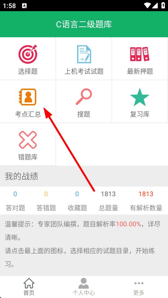 1、在C語言二級題庫首頁,點擊考點匯總,進入考點匯總界面。