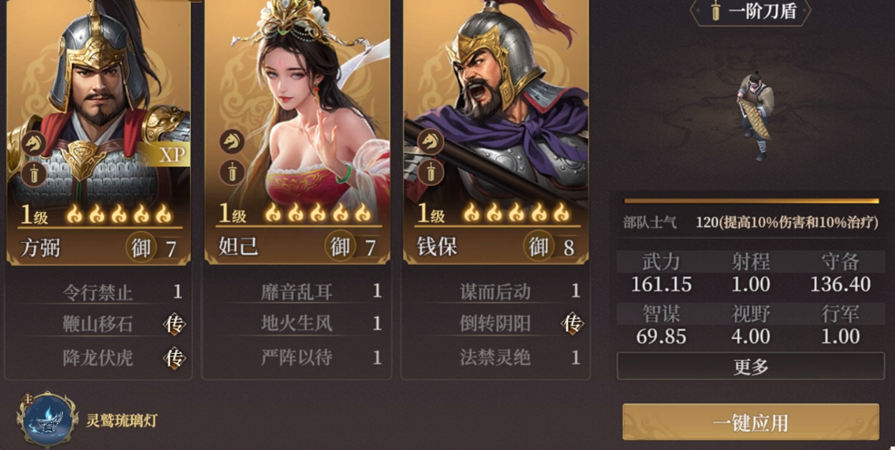 2、自帶術(shù)法深通韜略通過(guò)普攻對(duì)至多四個(gè)目標(biāo)造成2次智謀傷害可打出高額群體輸出需搭配能掛點(diǎn)燃的武將或術(shù)法才能發(fā)揮極限輸出效果。