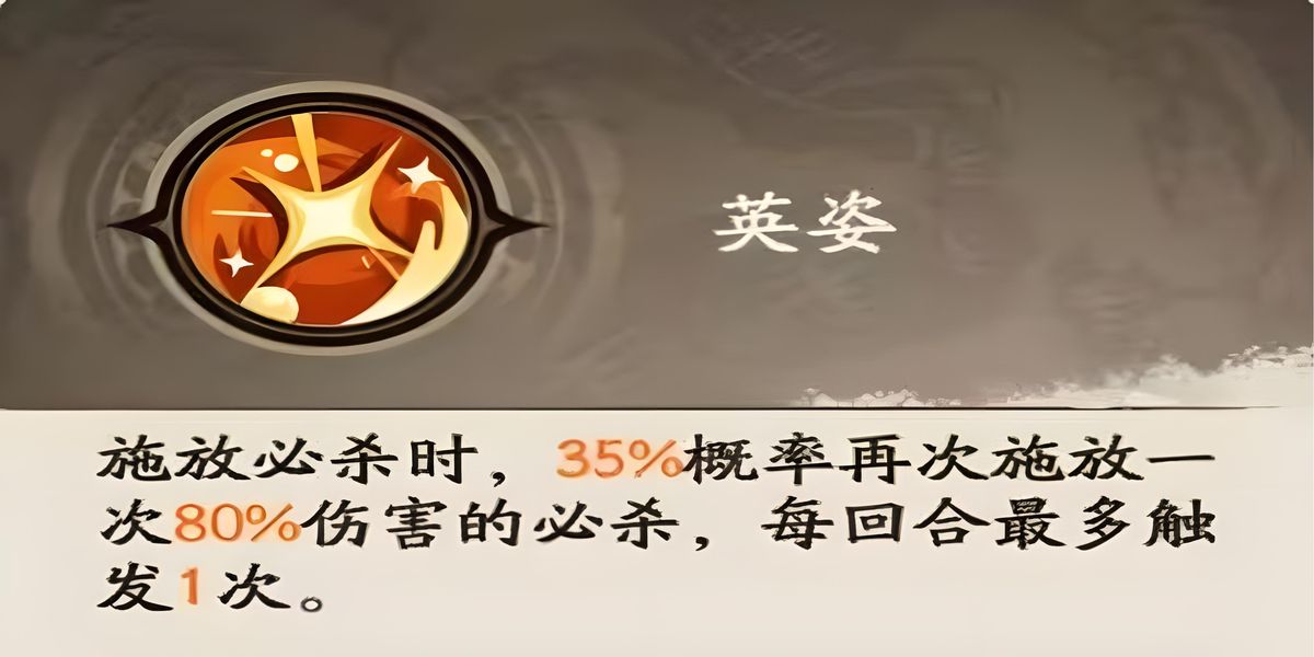 1、天賦英姿為施放必殺時35%概率再次施放一次80%傷害的必殺,每回合最多觸發(fā)1次,隨覺醒等級提升,觸發(fā)次數(shù)上限增加觸發(fā)概率提高必殺傷害提升且觸發(fā)的必殺傷害不再衰減。