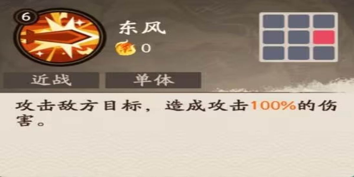 2、普攻東風是攻擊敵方目標,對敵方單體造成攻擊100%的傷害,屬于近戰(zhàn)單體攻擊,是基礎(chǔ)的攻擊手段,無額外消耗,能對單個敵人造成直接傷害。